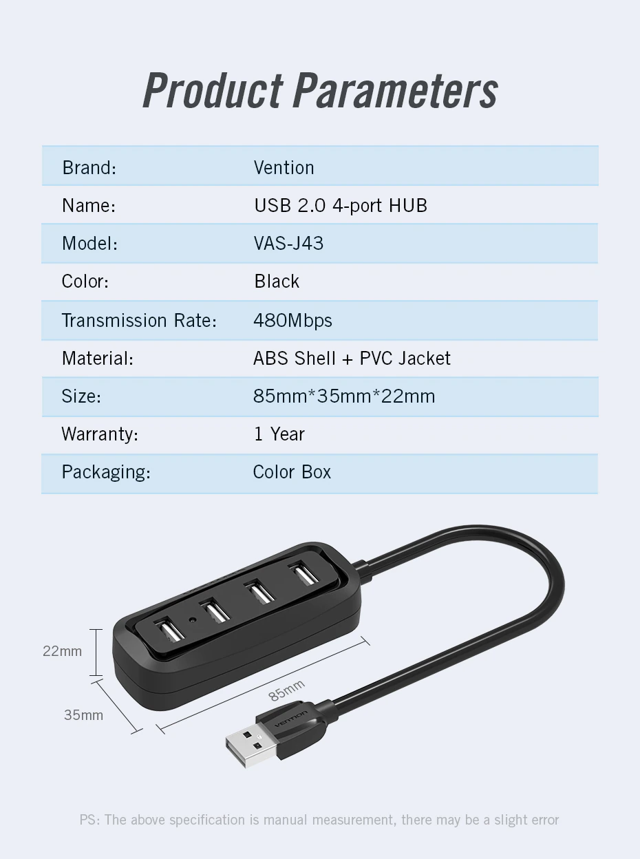 Hub USB 2.0 Vention 4 cổng VAS-J43 được thiết kế từ chất liệu nhựa an toàn, kích thước nhỏ gọn giúp bạn cầm nắm và dễ dàng bỏ túi, balo để di chuyển. Chiều dài 50cm - 1m giúp bạn sử dụng thiết bị trong phạm vi gần như kết nối điện thoại, laptop, bàn phím,